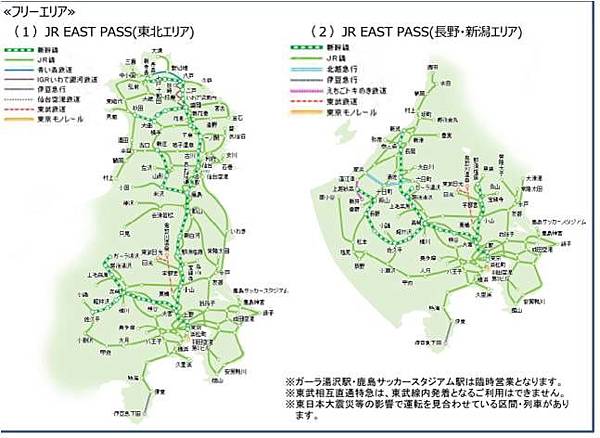 JR長野新瀉通票:長野和新瀉部分所有JR鐵道(含BRT)、東京單軌列車(羽田機場~濱松町)、東武鐵道、伊豆急行線全線、和えちごトキめき鐵道。(適用範圍和地區內請見右下圖)