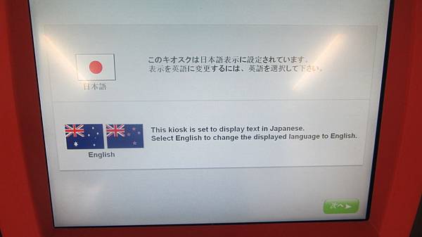 2. 輕觸螢幕後,即會進入辦理畫面。此時可選擇日文界面或是英文介面,選擇完畢後按右下方綠色按鈕。