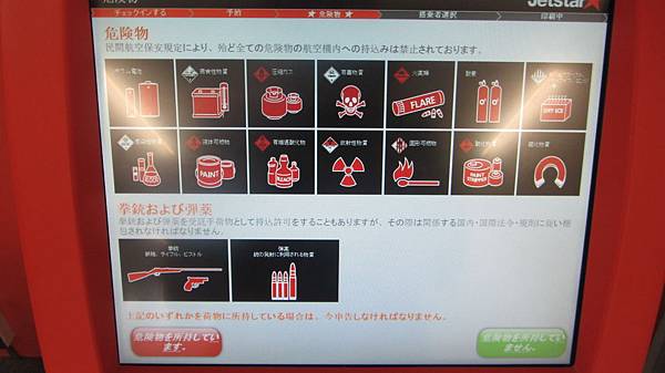 4. 輸入完成後,會跳轉下一個畫面。他會詢問是否有攜帶危險物品,但正常人都會勾選沒有這個選項吧!!如果沒有攜帶的話,請點選右下角綠色按鈕;若有,請點選左下角紅色按鈕。