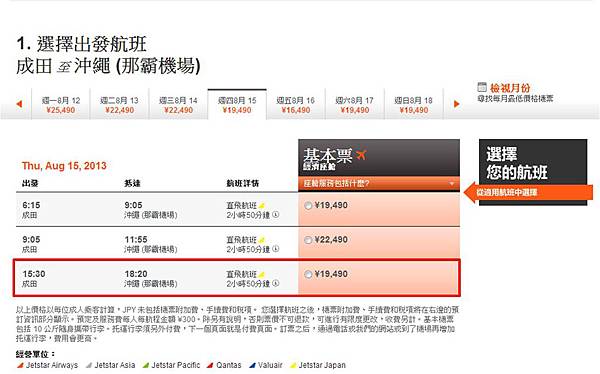 接著我查了Jetstar的的8/15成田飛往沖繩的機票價格,是單程一人19490。而且他出發時間是15:30。