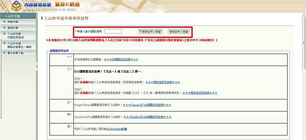 3. 在警政署網站於入山日前7日至30日內提出(不含周休及例假日)。若是遇到7日以上的連續假日,需在假日前一天的的上班日中午12點以前提出。