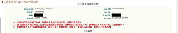 全部輸入後,點選「送出申請單」即完成申請手續,且會跳至新畫面(如下)。他會把申請者資料和所有入山者的資料都顯示在畫面。