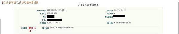 3. 進入查詢畫面後,會顯示申請者和所有入山者的資料,並會用紅字標示申請狀況。若為「禁止入山」,則會在紅字後面寫出禁止入山原因。