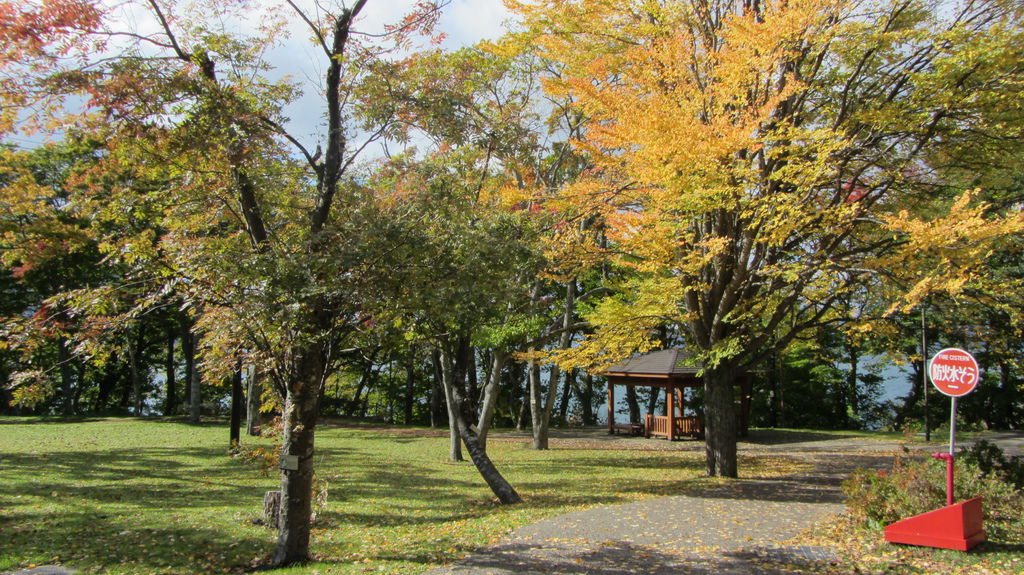 紅色、綠色和黃色的葉片佈滿天空,地上灑滿了黃色落葉,點綴用的小涼亭在陽光的照耀下顯得特別突出,這幅畫面真的是替我的北海道之旅拉開了美好的序幕。