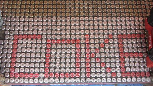 你以為你踏著的是結結實實的地板,但實際一看會發現,他是用可口可樂瓶蓋所組成的地板。