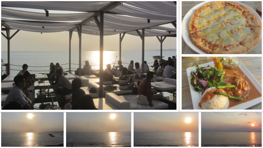 隨著時間的推移,盤內中的食物不斷減少,太陽也不斷西沉,海面的顏色逐漸變成深橘色,景色越來越令人陶醉,CABAN葉山最受到歡迎的景色逐漸呈現在眼前。