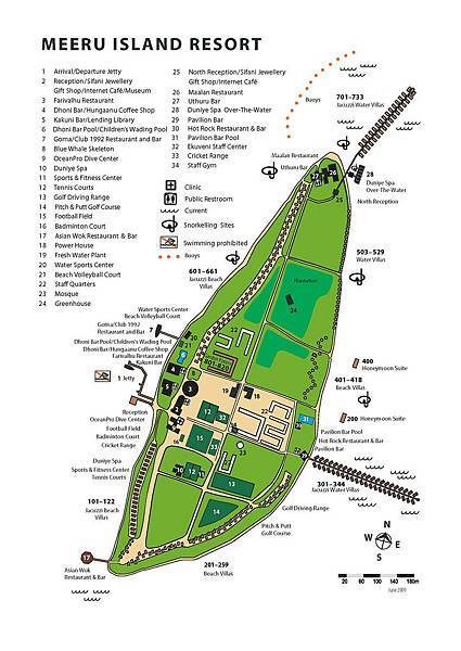 從導覽圖來看可以很快地看出兩條明顯的水上別墅,分別位在島的北方和東方。而島嶼的活動地點和飯店前台等幾乎集中在島嶼正中心,餐廳和酒吧則是散佈在島嶼各處,詳細等下文繼續介紹囉~