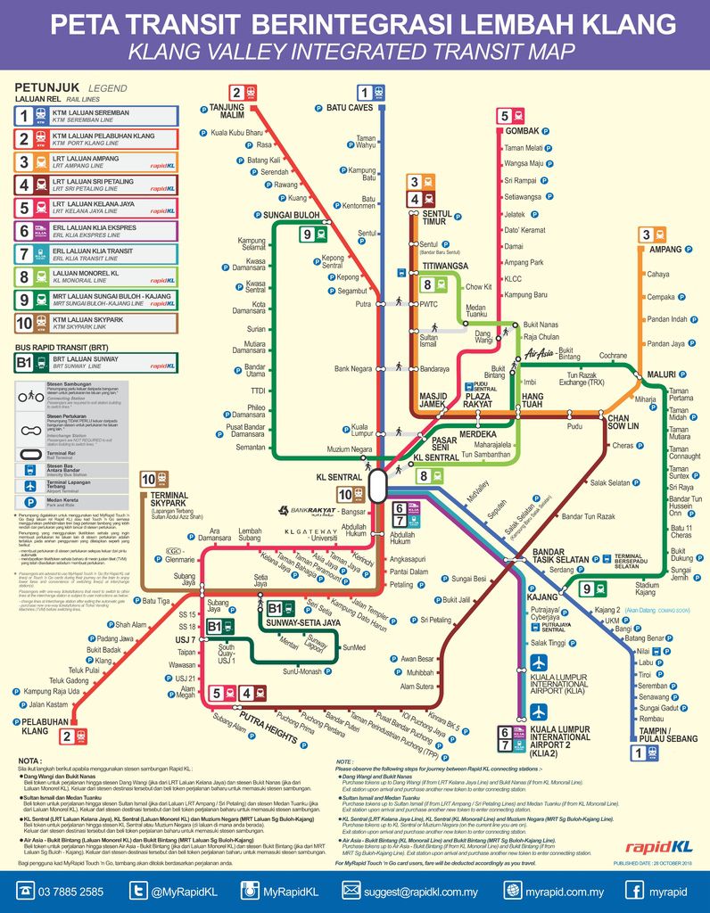 首先先來看看吉隆坡市區內和連接市區及機場的交通總路線(看詳細地圖可前往官網),目前吉隆坡市區內的交通共有10條線,共有5種交通工具,分別如下。