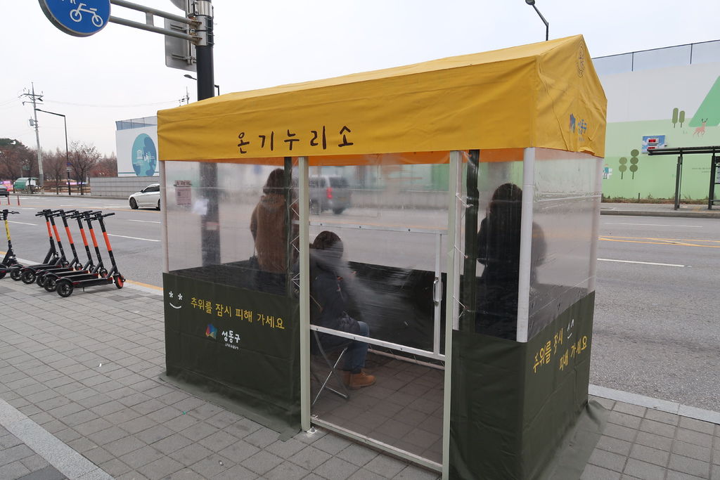由於首爾的冬天非常寒冷,所以絕大多數的公車站站旁都會有這樣臨時設置的封閉性等車空間,裏頭雖然沒有暖氣,但比起開放式空間要溫暖許多,可以多加利用。