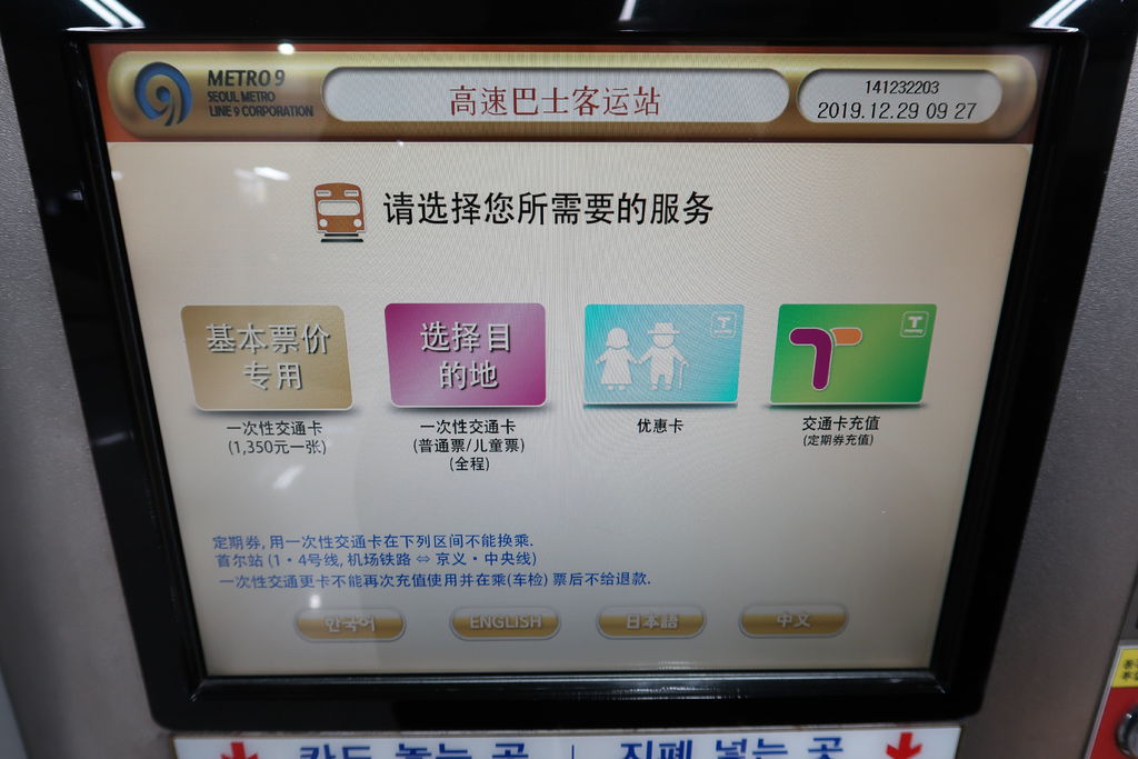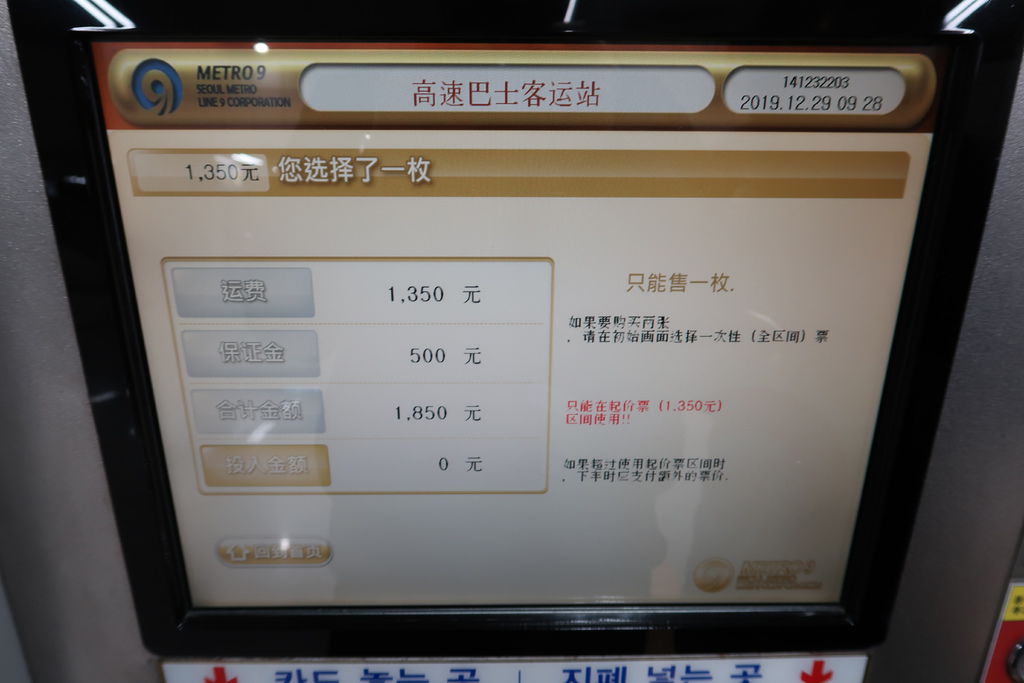 選擇完語言後,就是選擇要加值(最右邊)還是要購買單程票(最左邊),然後下一步就是金額顯示和付款,押金的500韓圜在出站後只要放入機器就會退還。