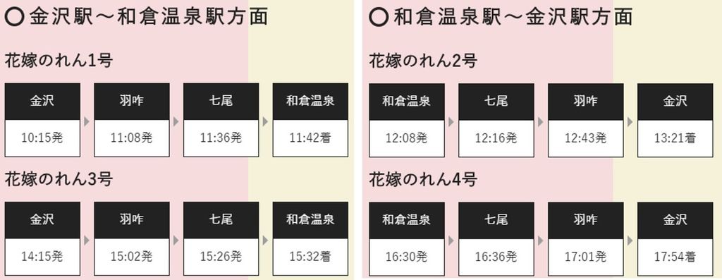 一天四班往返金澤和和倉溫泉的班次表如上,時刻表有可能因為修改而有所不同。運行時間基本上是以週五~周日和日本國定假日為主,偶爾周一也會運行,詳細可以參考官網中的運行日期表確認。