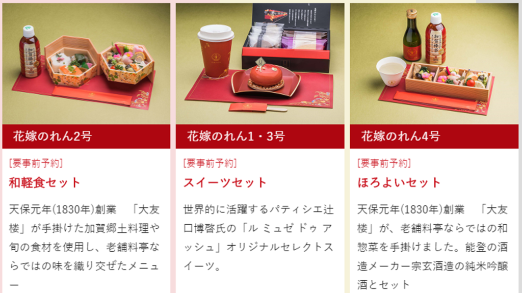 就如同其他觀光列車一樣,花嫁暖廉列車上也有提供事前可以預約的餐點,1和3號車是提供甜點套餐(2000日幣/人)、2號車是提供和輕食套餐(2500日幣/人)和4號車是提供微醺套餐(2000日幣/人)。