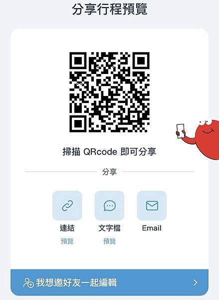 另外,如果是多人出遊的話,去趣chicTrip也有提供同行者線上共同編輯行程的功能,且規劃好的行程也可以匯出成旅遊小書,或透過QR code把行程分享給其他人。